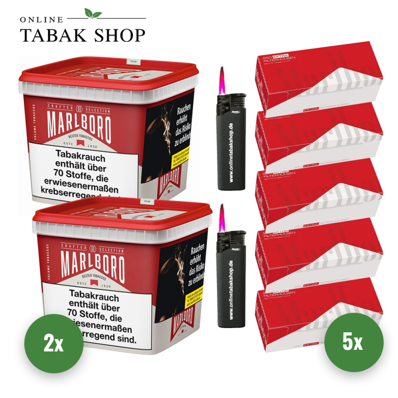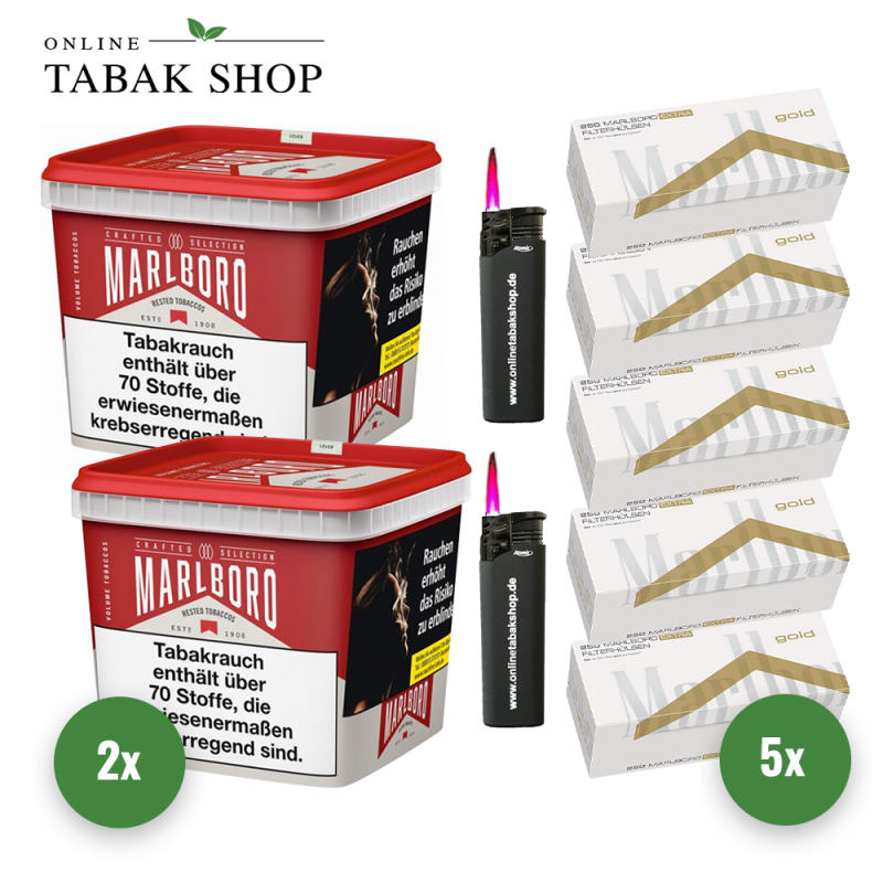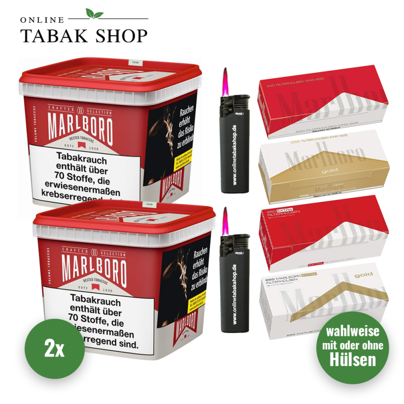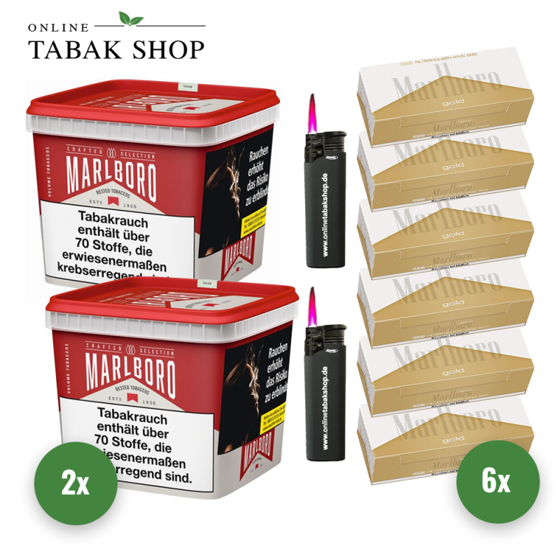 In den angebotenen Sparpaketen sind 2 x 180g Volumentabak enthalten. Diese reichen, abhängig von den Vorlieben des Nutzers, laute Herstellerangaben für bis zu 1.210 Zigaretten. Dazu erhalten Sie Wahlweise Marlboro Red, Marlboro Red Extra, Marlboro Gold oder Marlboro Gold Extra Hülsen und 2 Sturmfeuerzeuge.